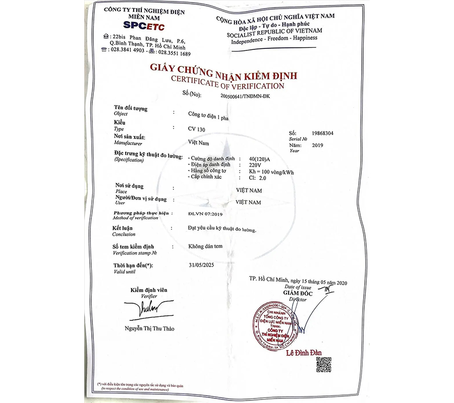 c) Chứng nhận kiểm định công tơ điện 1 pha EMIC CV140 40(120)A: