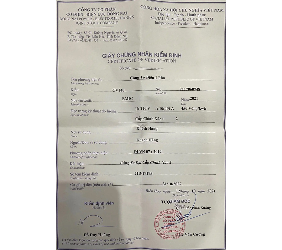 c) Chứng nhận kiểm định công tơ điện 1 pha EMIC CV140 10(40)A: