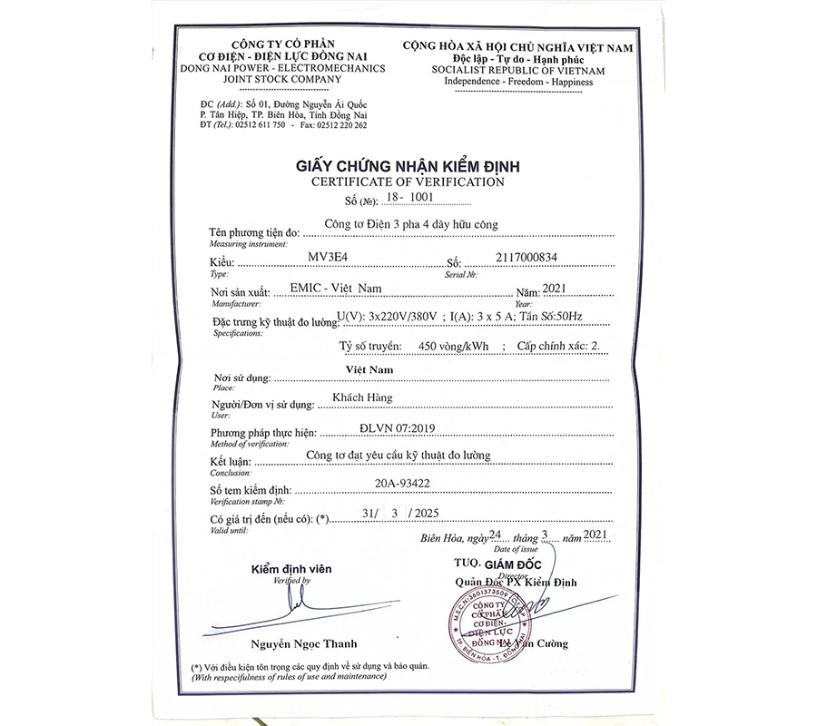 c) Chứng nhận kiểm định công tơ điện gián tiếp EMIC 3 pha MV3E4 5(6)A: